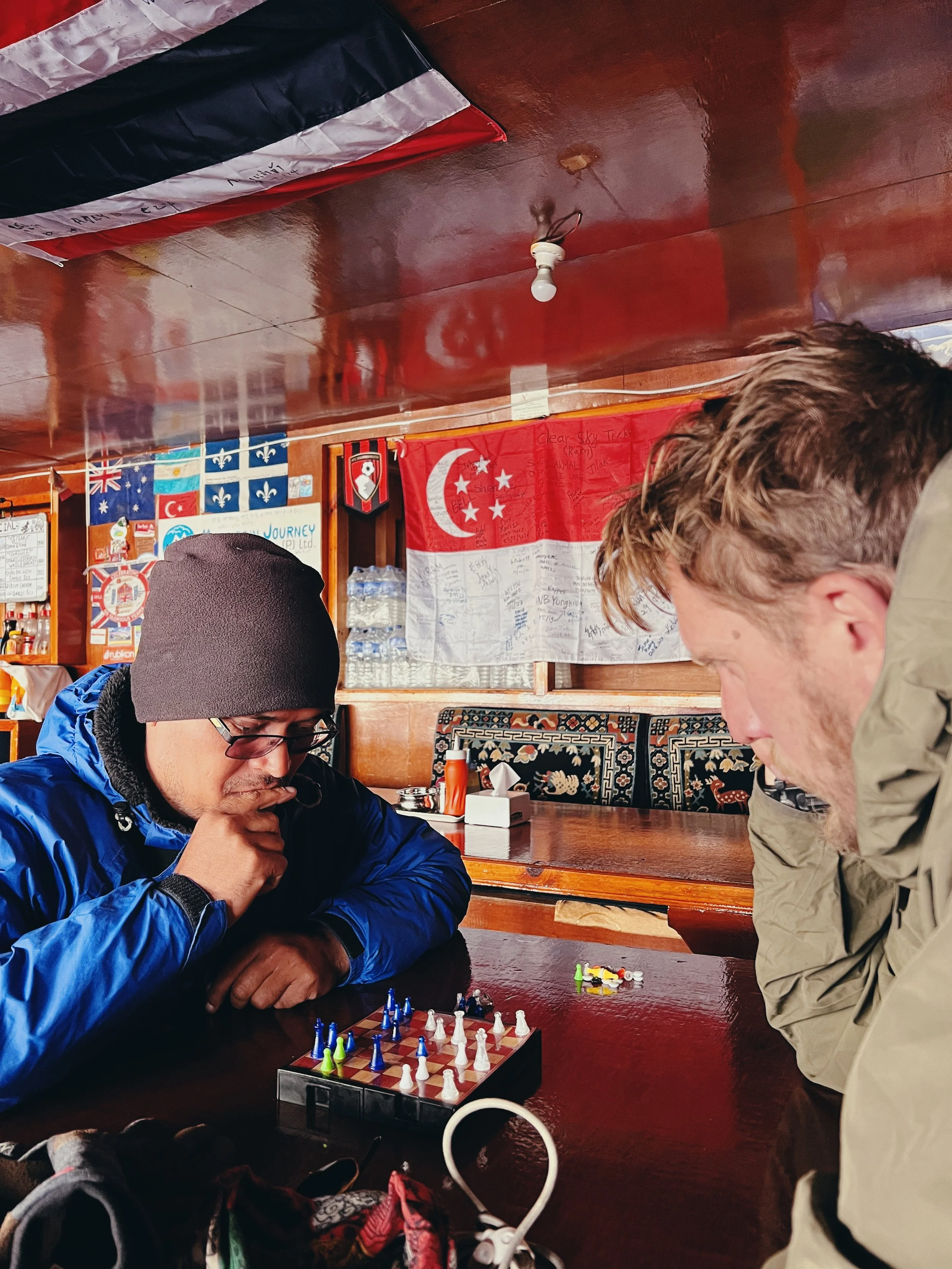 We reached Lobuche by sunset. There we ran into Baboo, the guide who had rescued Alvaro from my selfishness the day before. We played chess all night. Baboo obliterated me with gentle Nepali humour. He told us how he had been a Maoist rebel in his youth and once hid inside a rice jar for an entire day while government troops searched his village. He escaped by pretending to be blind and stumbling past the soldiers into the jungle. No wonder he beat me at chess.