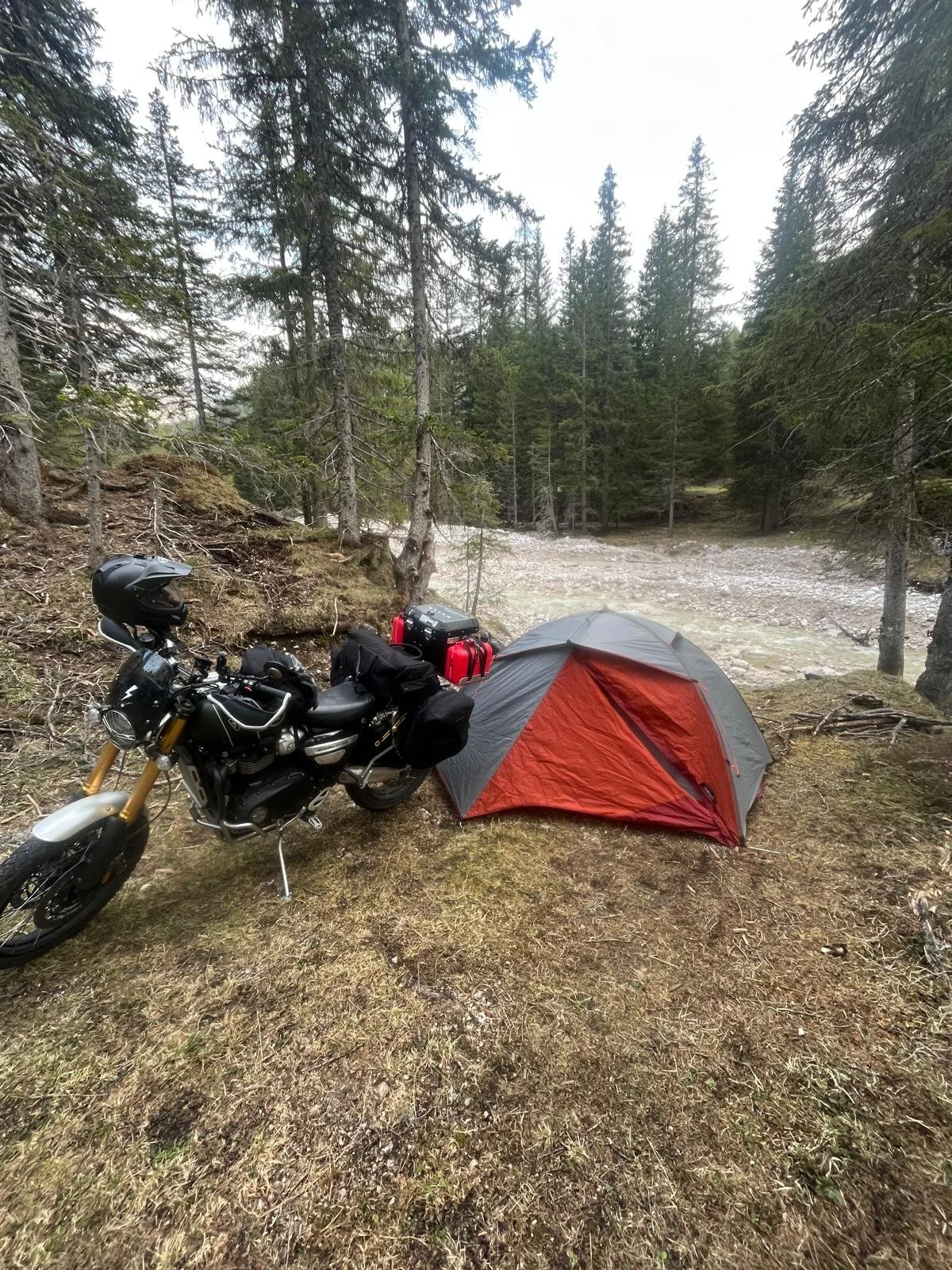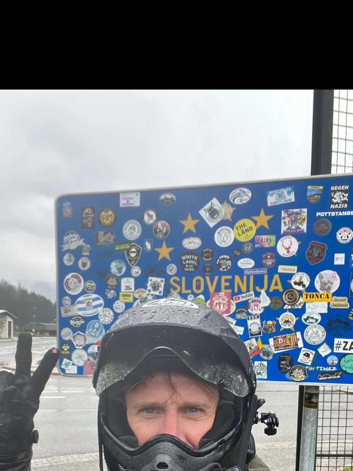 With little sleep, I’m up at five. All is good. I make a quick cup of coffee and get myself ready for the ride across Austria to Slovenia. The rain continues the whole way; I don’t mind, my gear is watertight, and either way, three months of my life getting beasted by the Royal Marines, perpetually wet, helps in dealing with the cold and wet. I did have my full Goretex on; no point being wet just for fun. I also know that all my gear on the bike is double waterproofed, and I always have some dry gear to switch into once I set up camp, which keeps me going, thanks, Royals...